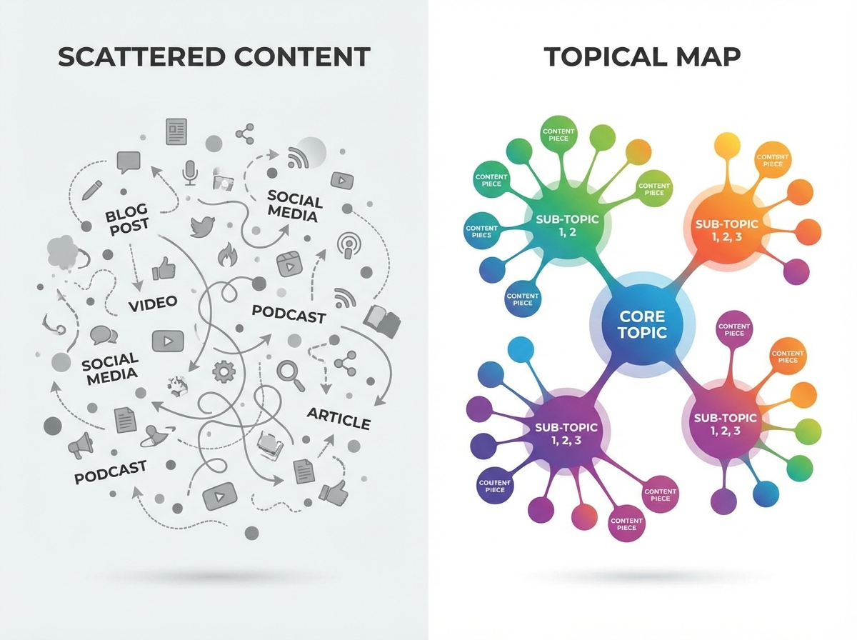 Here's a pattern I see constantly. A company publishes 50 blog posts over six months. Topics are all over the place. Some rank, most don't. There's no internal linking strategy. No hierarchy. No plan for how post #23 supports post #7. Then they wonder why Google treats their site like a grab bag instead of an authority.